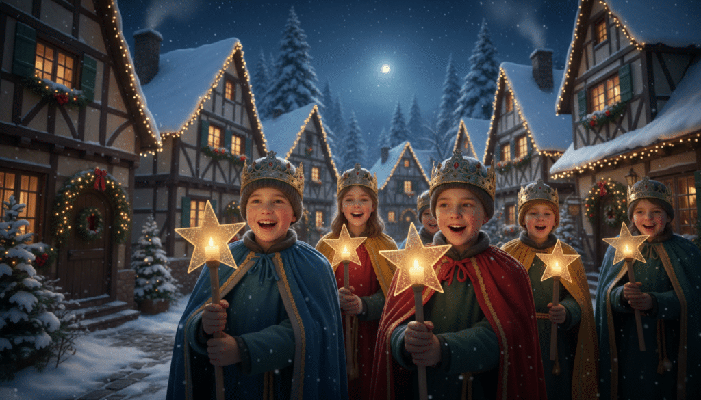 - Die Sternsinger selbst: Typischerweise sind es drei Kinder oder Jugendliche, die als die Heiligen Drei Könige Caspar, Melchior und Balthasar gekleidet sind. Sie tragen prächtige Gewänder, oft mit goldenen oder bunten Stoffen verziert, und Kränze oder Kronen auf dem Kopf. Ein vierter Sternsinger repräsentiert oft den Stern selbst oder einen Engel.